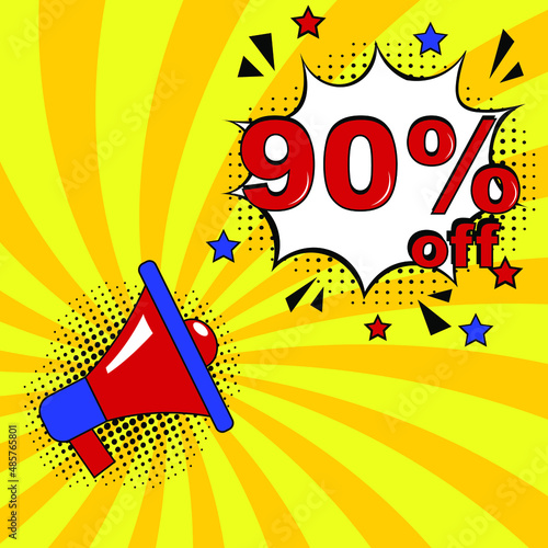 Pop art comic sale discount promotion banner. 90 percent off. Comic text 90 percent sale set discount. Promo sale poster. Sales concept