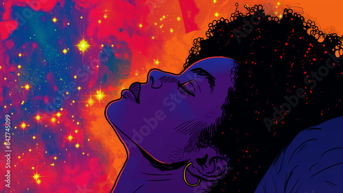 Pop art Fortune telling concept. Silhouette of an African American woman lying under stars and galaxies in her dream. Colorful background in pop art retro comic style.