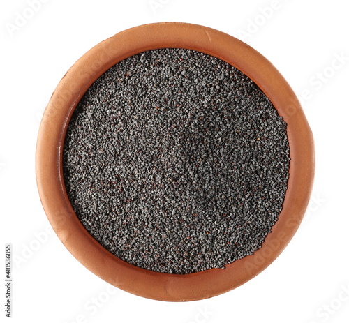 Poppy seeds in clay pot isolated on white background, top view