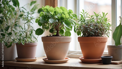 Popular Potted plants in a terracotta pot On the window sill of the house window, balcony, succulent, begonia, blooming, ficus