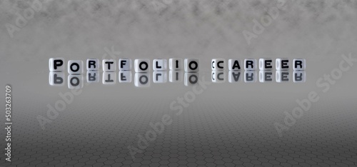 portfolio career word or concept represented by black and white letter cubes on a grey horizon background stretching to infinity