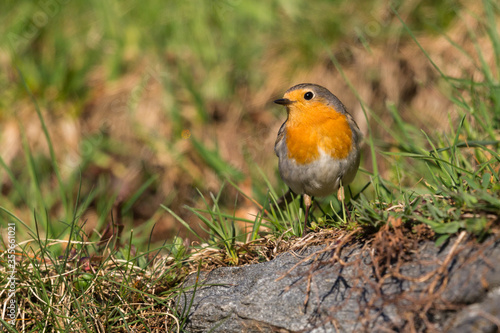 portrait european robin (erithacus rubecula) standing in green meadow
