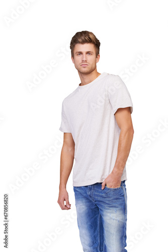 Portrait, fashion and confident man in jeans isolated on a transparent png background. Serious, style and person with hands in pocket, casual clothes and trendy tshirt for cool aesthetic in Australia