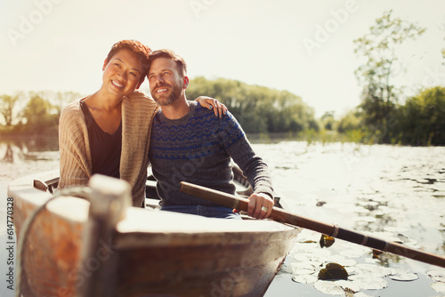 Portrait hugging couple canoeing on sunny lake