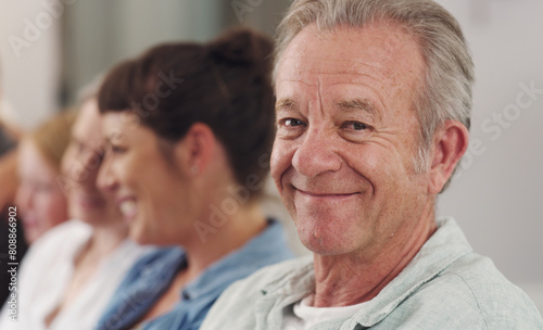 Portrait, mature man and family on sofa together for love, support and retirement visit on weekend break. Male person, smile and people on couch in home happy for care, support and relationship