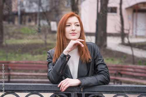 Portrait of a beautiful and positive redhead woman with clothes in grunge style. Posing while walking