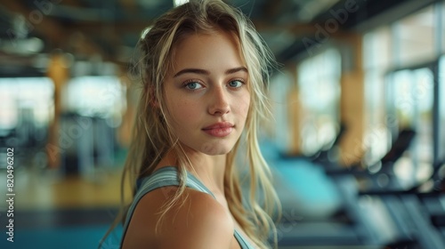 portrait of a beautiful caucasian young woman in training sportswear looking at the camera while in the gym