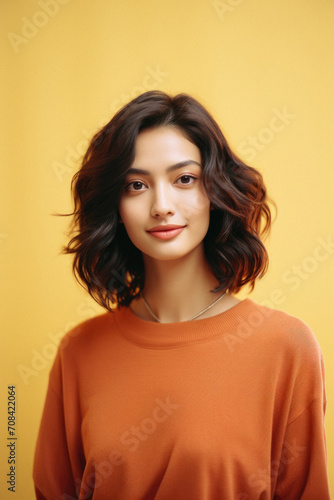 Portrait of a beautiful young asian woman in orange sweater on yellow background