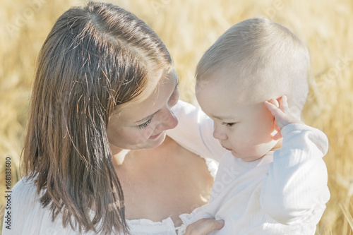 Portrait of a beautiful young mother talking to her small son in wheat field at sunny summer day