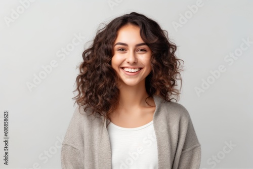 Portrait of a beautiful young woman with curly hair smiling at camera