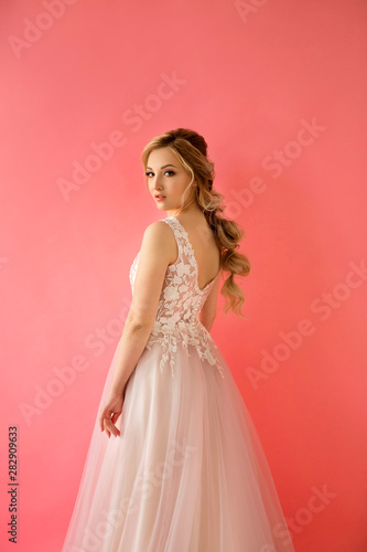 portrait of a beautiful young woman with makeup and hairstyle in a beautiful dress on a pink background