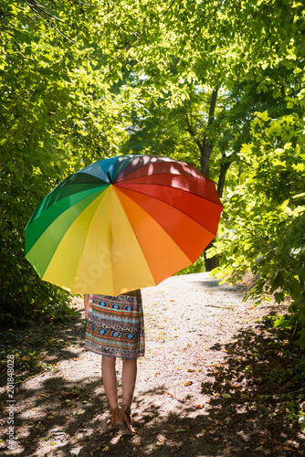 Portrait of a beautiful young woman with parasol walking through summer forest as seen from the back