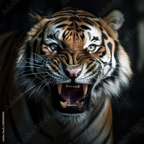 Portrait of a Bengal tiger, grin, big teeth. Realistic drawing. Beautiful wild animal.