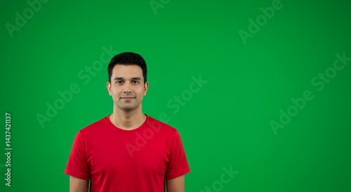 Portrait of a Calm Young Man in Red T-Shirt Against a Green Screen