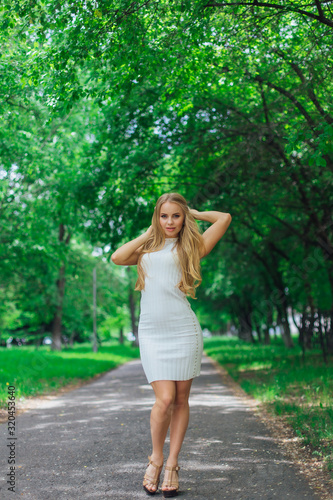 Portrait of a charming blond woman wearing beautiful white dress standing on the road under trees.