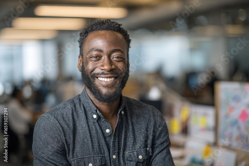 Portrait of a cheerful man with standing confidently with arms crossed in a contemporary open-plan office workspace.
