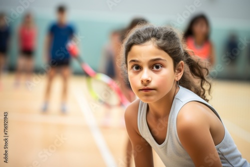 Portrait of a concentrated kid female playing squash on a court. With generative AI technology