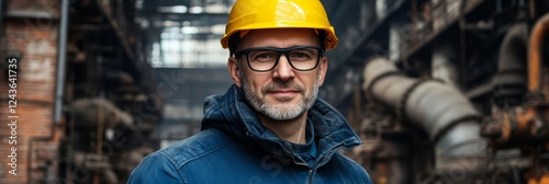 Portrait of a Confident Engineer in Hard Hat and Safety Glasses, Industrial Factory Setting