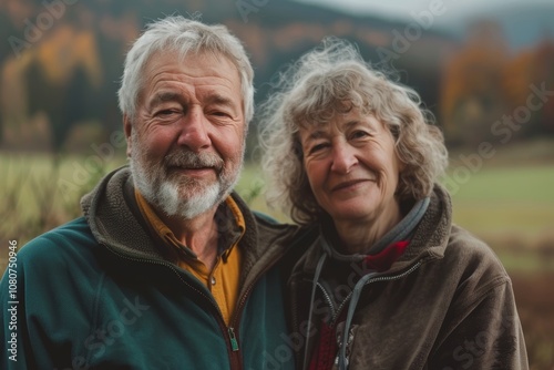 Portrait of a content caucasian couple in their 50s wearing a zip-up fleece hoodie over quiet countryside landscape
