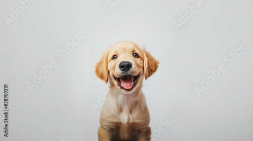 Portrait of a cute and happy puppy dog filled with joy in a studio with a white background for an animal or pets collection with copyspace
