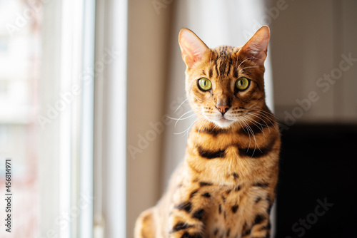 Portrait of a cute Bengal cat looking in camera, Close up. Cat in the home interior, staying stay by the window, on a cat's shelf of a cat's house. Pets concept, pets friendly and care concept.