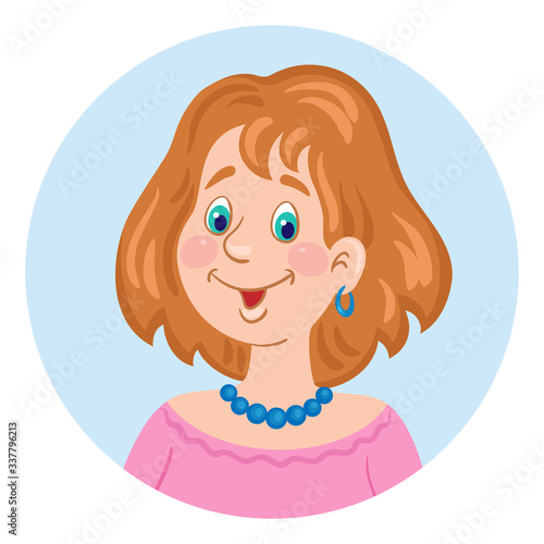 Portrait of a cute girl in a pink dress. Avatar icon in the circle. Isolated on white background. Flat style. Vector illustration.