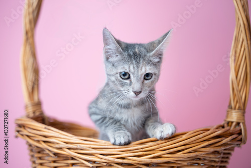 Portrait of a cute kitten in a basket, pink background, isolated