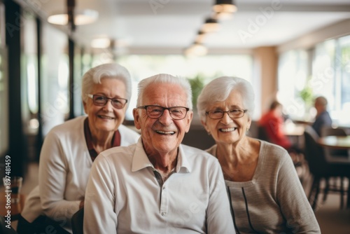 Portrait of a elderly group of seniors smiling in nursing home