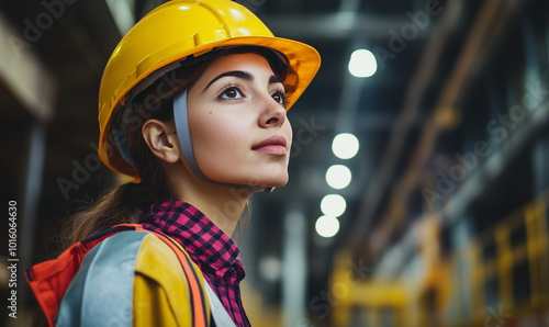 Portrait of a female construction worker or architect with hardhat looking at camera and smiling.