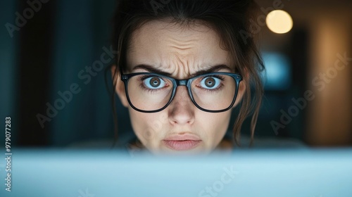 Portrait of a Frustrated Woman Glaring Intensely at a Computer Screen Expressing Strong Emotions and Dissatisfaction Over an Unresolved Technical Problem or Glitch in the Workplace