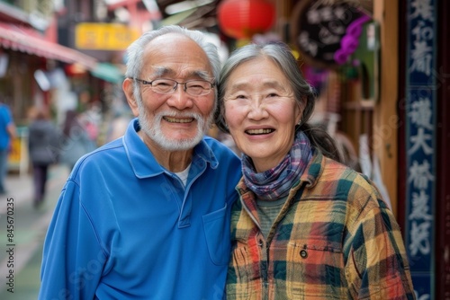 Portrait of a glad asian couple in their 80s wearing a comfy flannel shirt on vibrant market street background