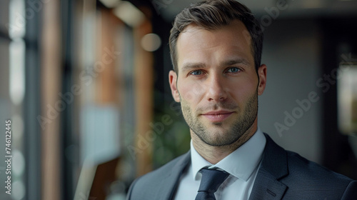 Portrait of a Handsome Business Man Inside an Office Building smiling and looking at the Camera