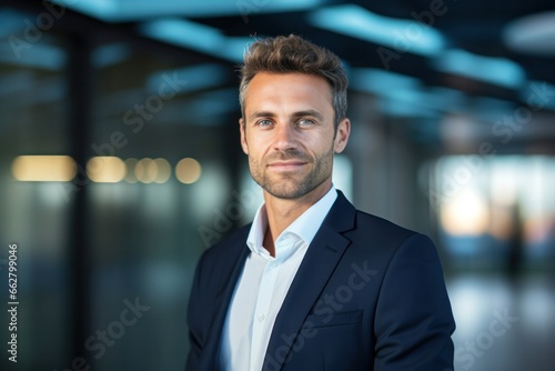 Portrait of a handsome CEO businessman smiling at modern office, Generative AI