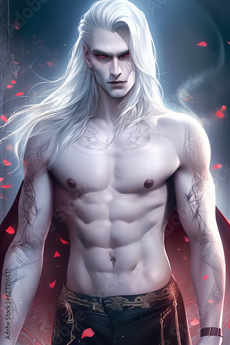 Portrait of a handsome male vampire with beautiful muscular body, fantasy, muscular nakachean strong man, man with open torso, abs, man with white long hair,male vampire, Generative AI