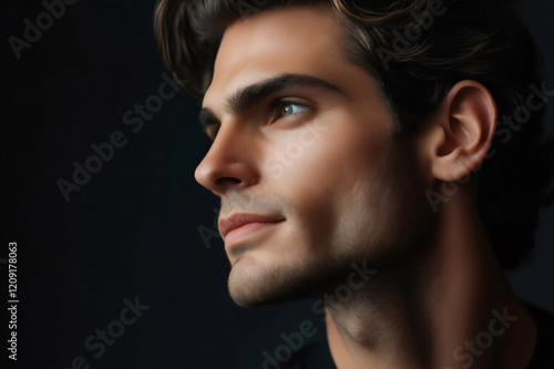 Portrait of a handsome man with perfect skin and hair style, promoting men's skincare products