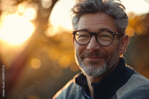 Portrait of a handsome middle-aged man with gray beard and glasses in the autumn park.