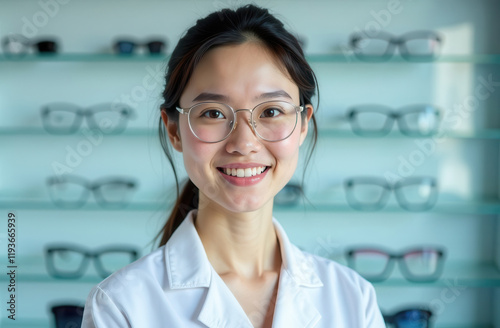 Portrait of a happy Asian woman ophthalmologist against the background of a stand with glasses in optics. Salesperson, glasses consultant in a vision glasses store.