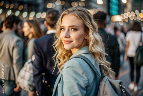 Portrait of a happy beautiful traveler with a backpack in the city on the background of a beautiful bokeh. Traveling alone, a lifestyle. A young tourist is enjoying his vacation.