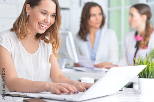 Portrait of a happy business woman using laptop