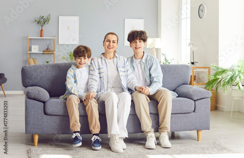 Portrait of a happy joyful mother with two smiling sons, schoolboy sitting on the coach holding each other's hands and looking at camera. Unity within the family. Love and family support concept.