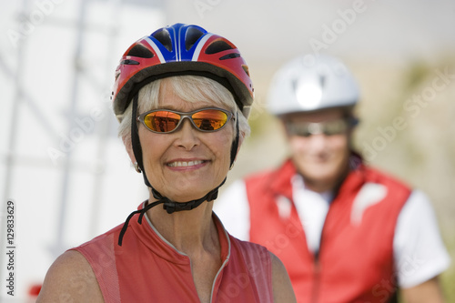 Portrait of a happy senior woman with man in the background