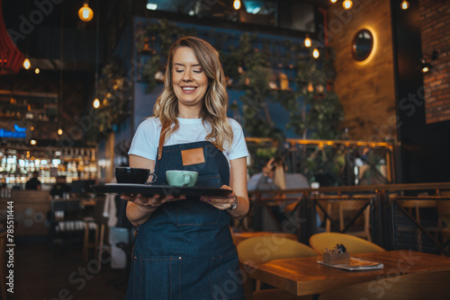 Portrait of a happy waitress working at a restaurant and looking at the camera smiling. I Love My Job! Waitress is laughing and enjoying being at work, while she is holding coffee