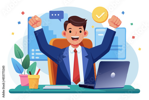 Portrait of a happy young man businessman who is happy about financial success sitting in the office at the table holding a credit card in his hands and showing a victory gesture with his hand modern
