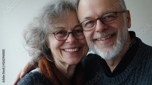 Portrait of a joyful elderly couple smiling and embracing each other, with a soft white background