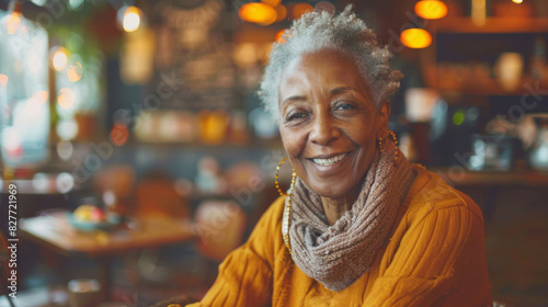 Portrait of a joyful elderly lady with a warm smile in a coffee shop setting