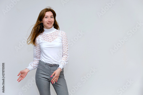 Portrait of a knee-high young pretty brunette girl woman with beautiful long hair on a white background in a white jacket and gray pants. He talks, shows his hands with emotions in various poses.