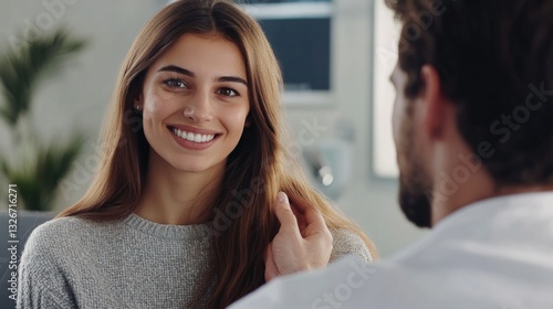 Portrait of a male doctor support young smiling female patient putting hand on her shoulder. Physician sitting in medical clinic giving consultation a woman during medical examination in office