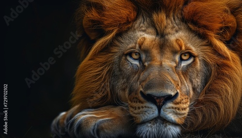 Portrait of a male lion on a black background. Close-up