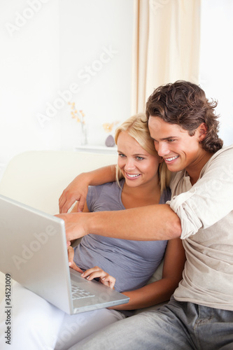 Portrait of a man showing something to his wife on a notebook