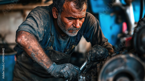 Portrait of a mechanic repairing a machine, covered in grease, holding tools, symbolizing skilled labor, dedication to craftsmanship, and hard work in industrial maintenance.